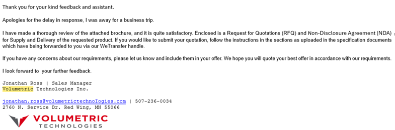 Do not reply to the message. Our former employee, Johnathon Ross has no involvement in this and is no longer at Volumetrics.